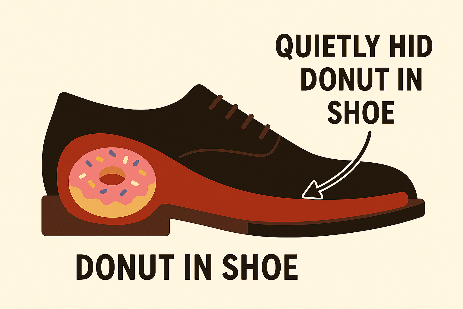 A loyalty card under the desk shows every 10th donut redeemed by shoe size. The bar code rings like laughter.